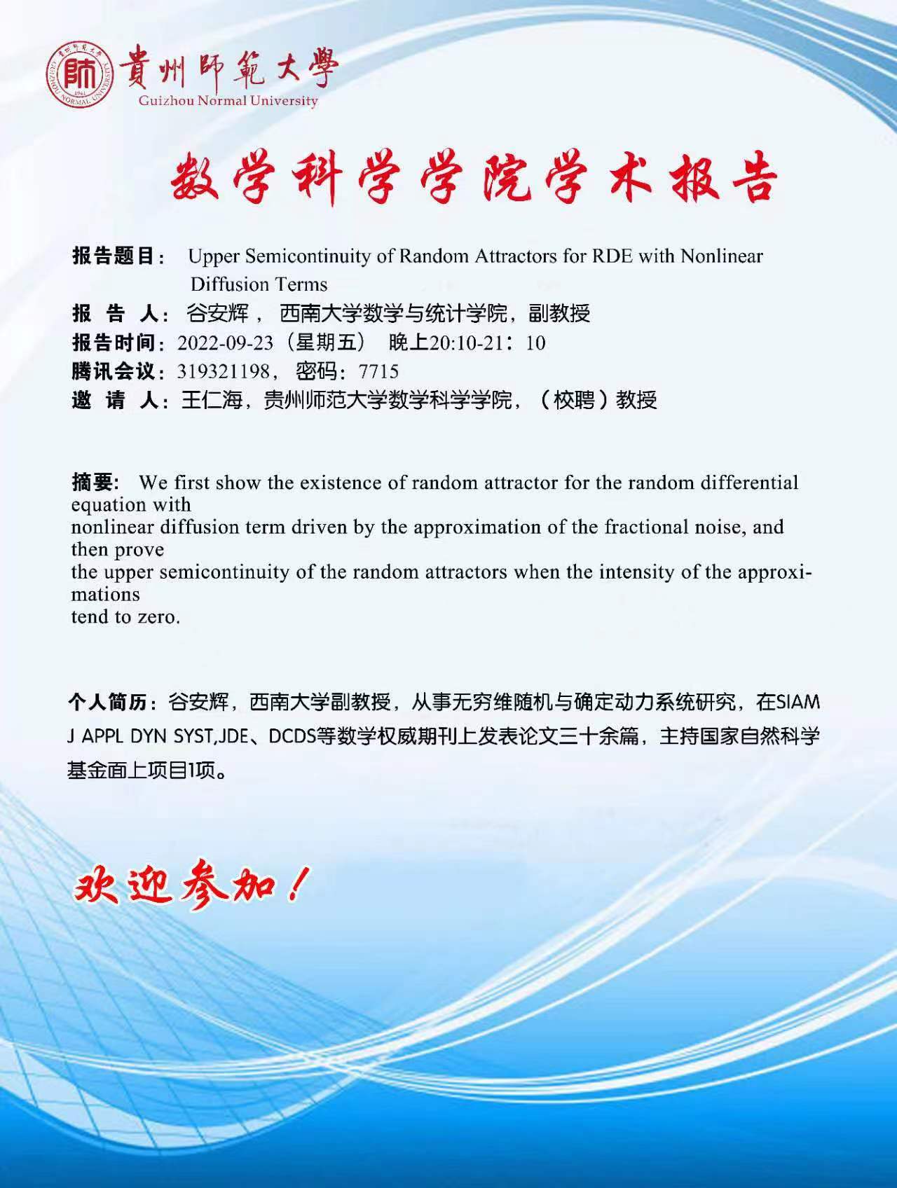 个人简历:谷安辉,西南大学副教授,从事无穷维随机与确定动力系统研究,在SIAM J APPL DYN SYST,JDE、DCDS等数学权威期刊上发表论文三十余篇,主持国家自然科学基金面上项目1项。