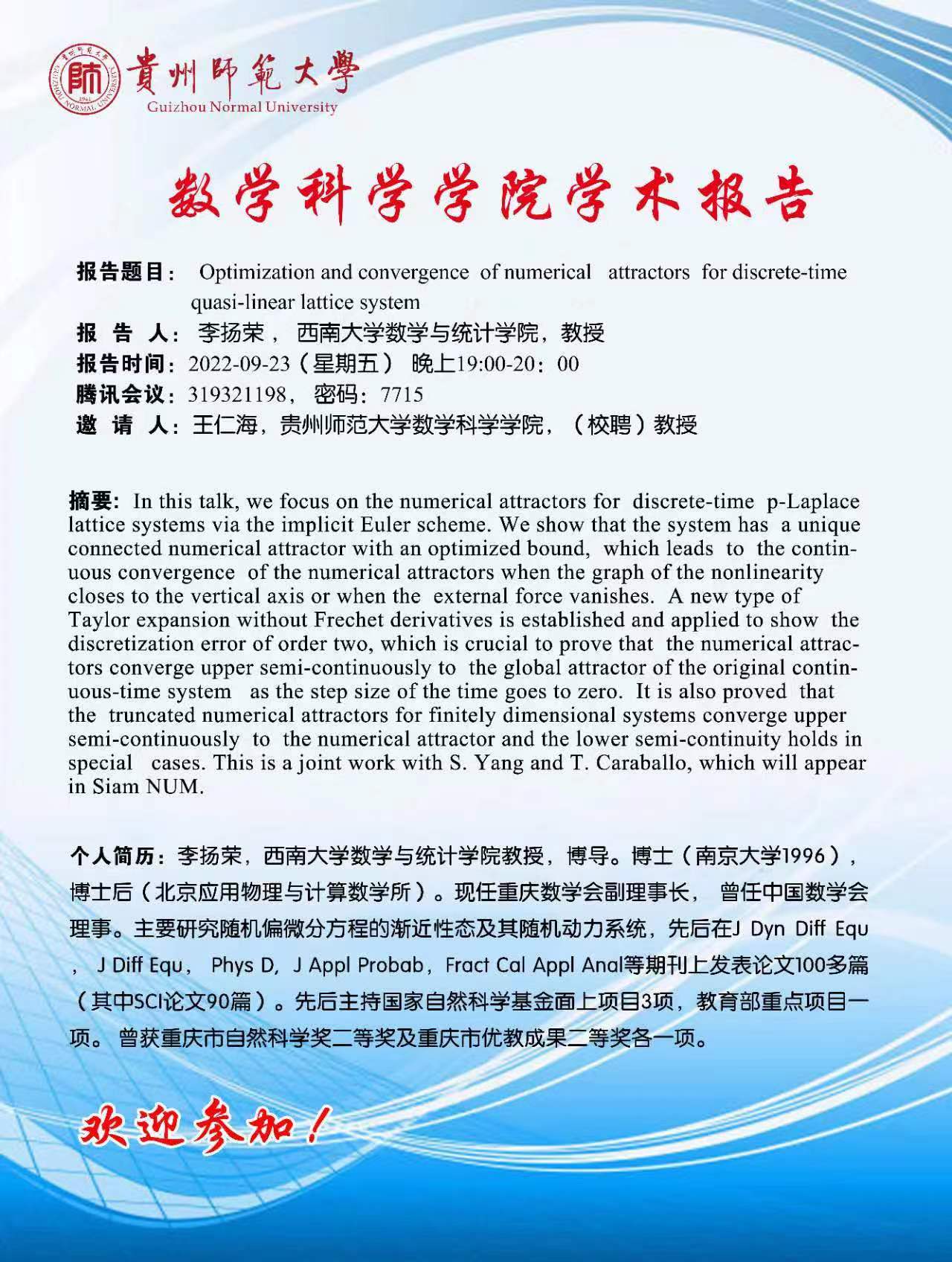 报告题目: Optimization and convergence of numerical attractors for discrete-time quasi-linear lattice system