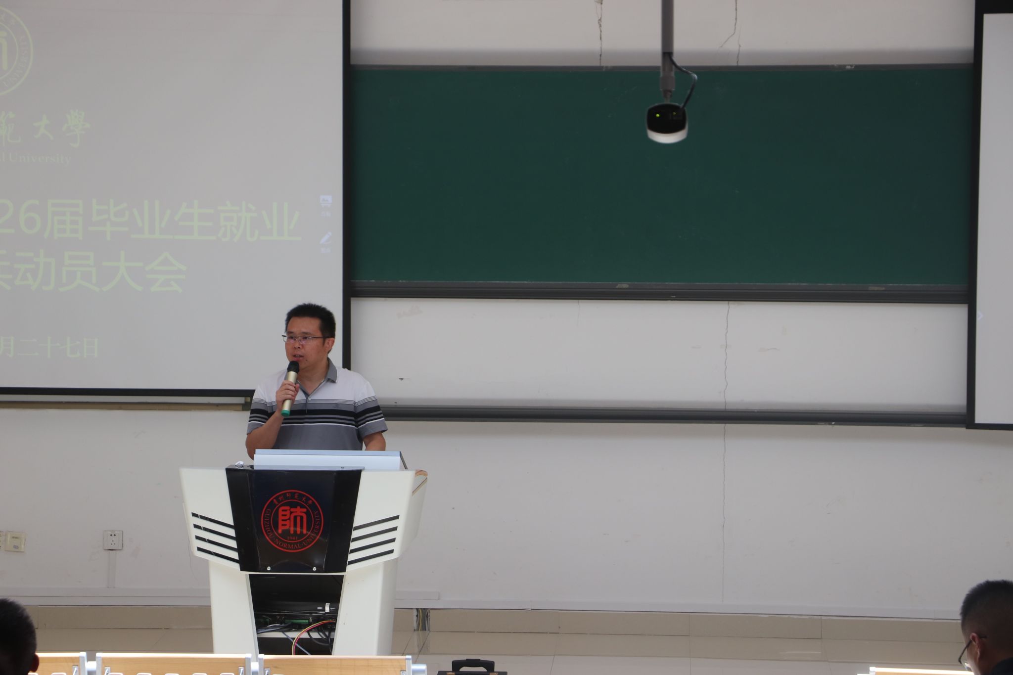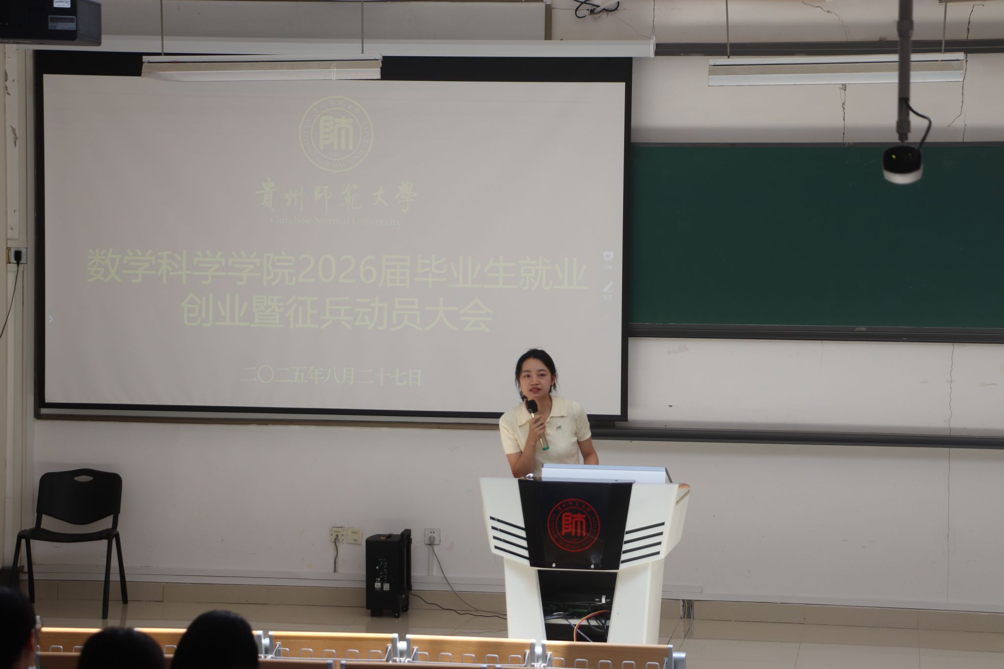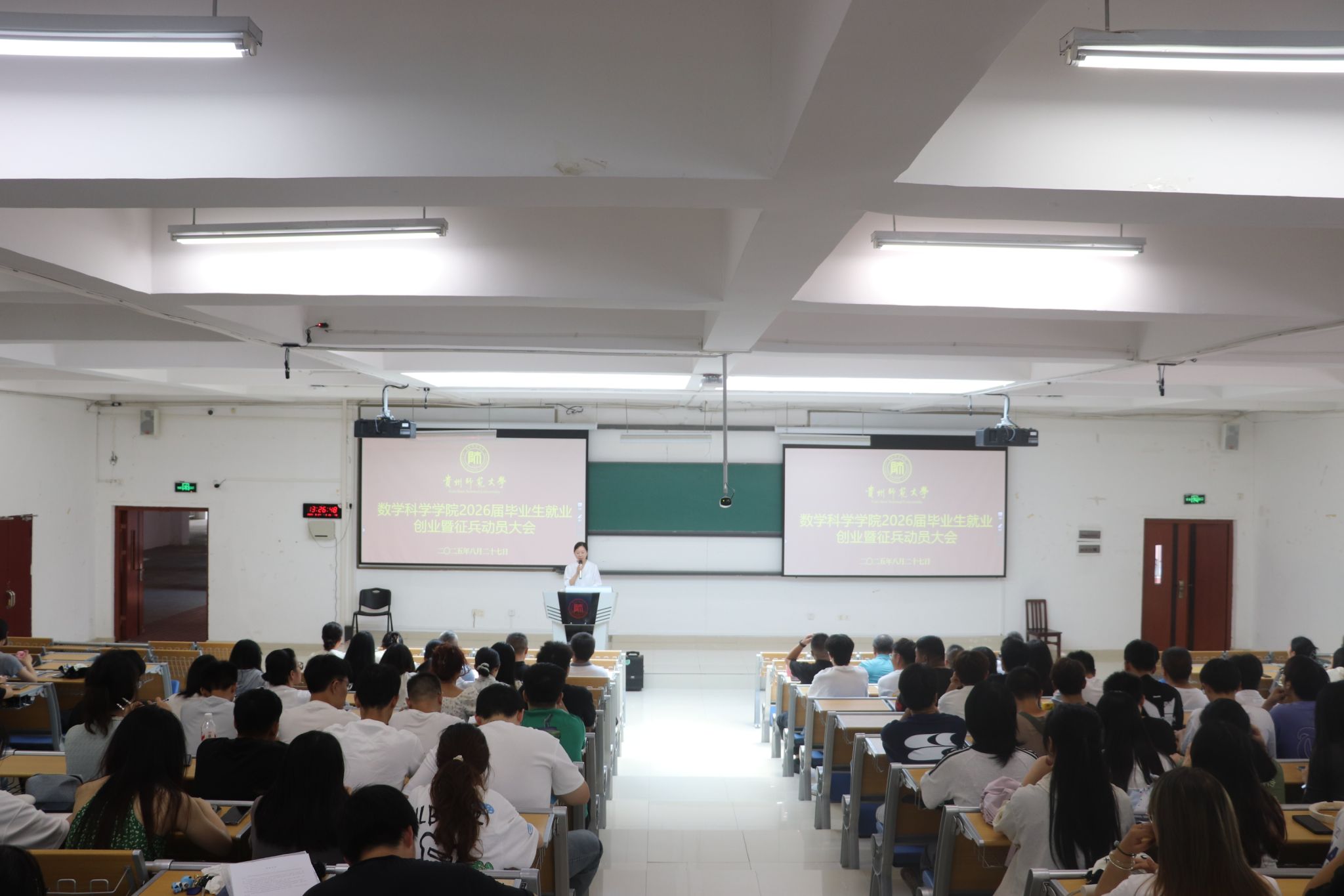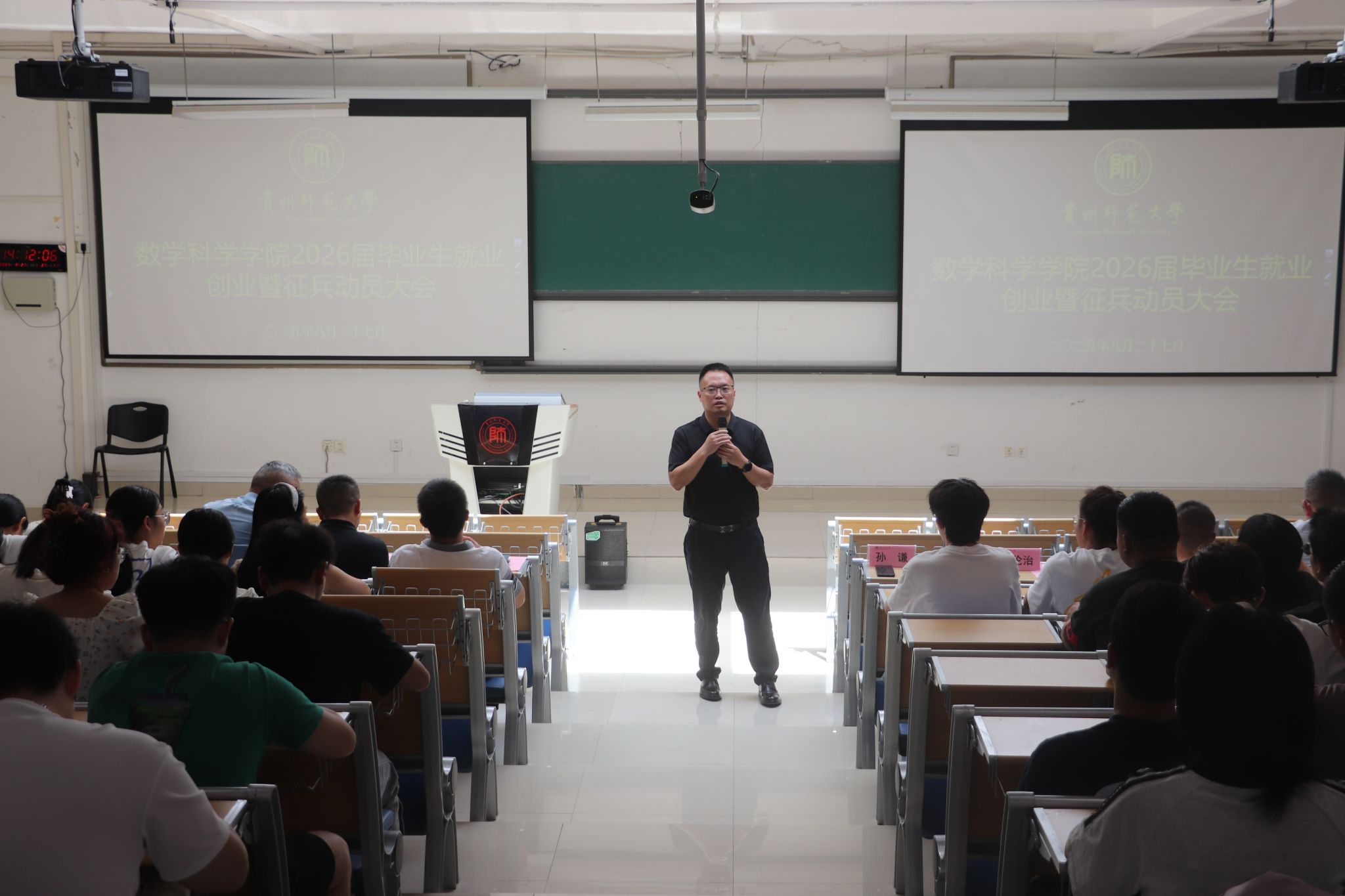 8月27日,太阳成集团tyc122cc在东校区公教6301教室举行2026届毕业生就业创业暨征兵工作动员大会。党委书记孙谦、经理吴云顺、党委副书记江剑虹、副经理邓伦治、龙见仁,数学与应用数学系主任唐树安、应用统计学系主任刘红军、信息与计算科学系教师代表安静、征兵工作联络员李丹、毕业班辅导员徐彬及全体2026届本科毕业生参会。