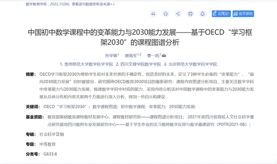 近日,公司数学与跨文化数学教育研究所孙学敏老师、唐海军博士以及北京师范大学曹一鸣教授在《数学教育学报》2022年第6期发表了题为“中国初中数学课程中的变革能力与2030能力发展——基于OECD学习框架2030的课程图谱分析”的研究论文。《数学教育学报》是中国联合国教科文组织指导刊物,是目前国内数学教育领域最高层次的学术性刊物,现为“全国中文核心期刊”、“中国科技核心期刊”、“CSSCI来源期刊“RCCSE中国核心学术期刊(A。被中国科技论文统计源期刊、中国学术期刊综合评价数据库、中国学术期刊(光盘版)、中国期刊网、中国数学文摘、中国数学文献数据库、美国《数学评论》(MR)、德国《数学文摘》(ZBI)、中国人民大学报刊复印资料等收录。