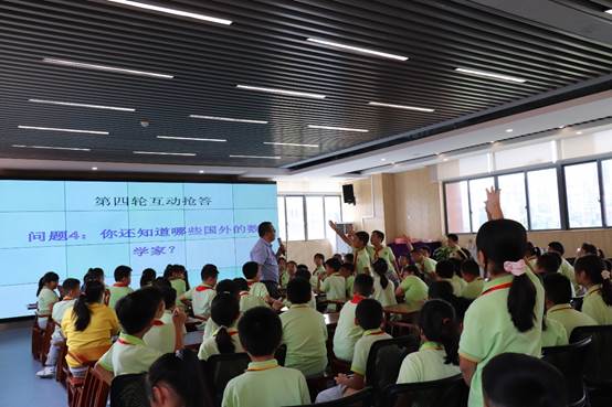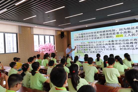 “同学们,你知道的数学家都有谁呢?”活动伊始,杨孝斌向同学们抛出一个问题。教室内,同学们纷纷举起手,“陈景润”“欧拉”“华罗庚”“高斯”……顺着同学们的答案,杨孝斌绘声绘色地讲述了“数学家华罗庚的故事”“小欧拉的故事”和“小高斯的故事”,通过一个个生动的故事提炼数学家精神,师生频繁而和谐的互动让现场氛围活跃。